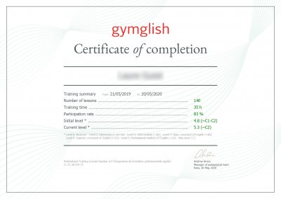 Os alunos podem testar qualquer curso Gymglish gratuitamente, sem qualquer compromisso de compra. Eles receberão uma avaliação inicial do seu nível acompanhada de um resumo personalizado dos pontos fortes, pontos fracos e áreas a serem revistas. Todas as avaliações são feitas usando os níveis reconhecidos no Quadro Europeu Comum de Referência para as Línguas (QECR).